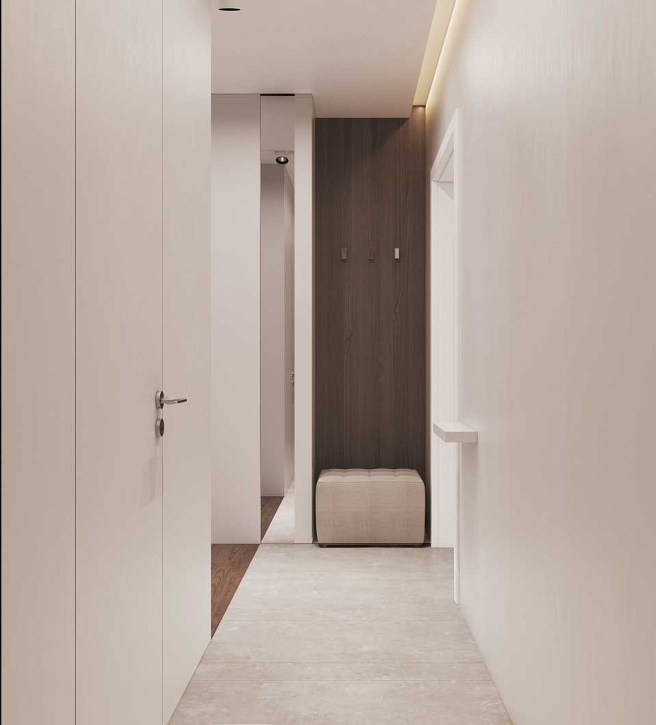 В качестве цветового решения предложена контрастная комбинация песочного в сочетании с коричневыми деталями оттенка молочного шоколада. Это делает светлый интерьер квартиры уютным и комфортным, а использованный тон стен, мебели, ковра на полу способствуют визуальному расширению комнаты.