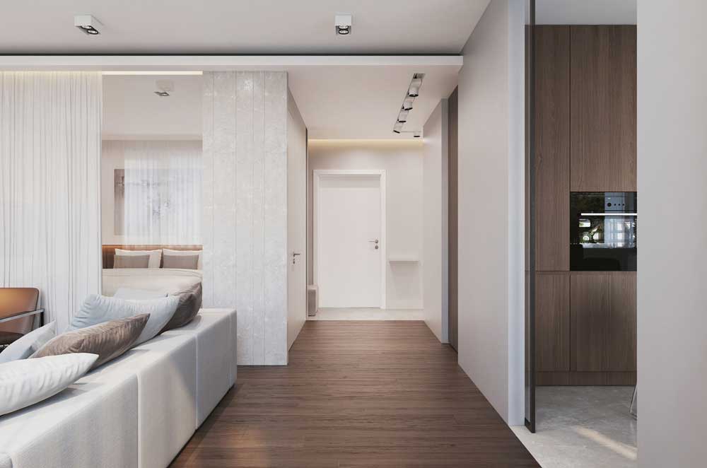 - Для сохранения целостности пространства можно использовать одни обои во всей квартире или монолитное напольное покрытие без порожков.
