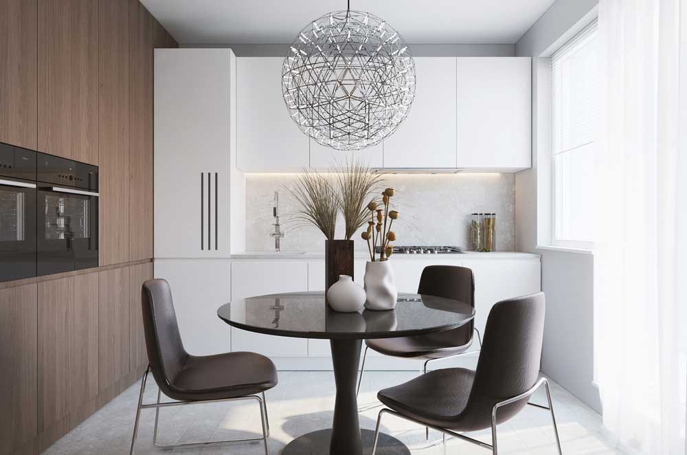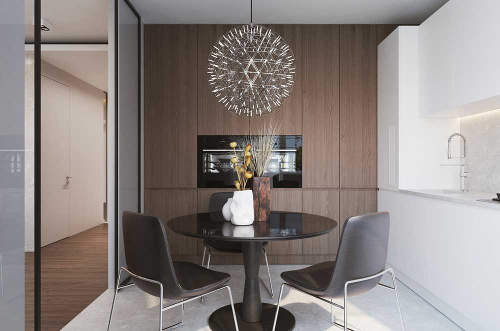 Этот прием позволяет сделать помещение зрительно более просторным и перенести обеденную зону в гостиную, что особенно важно для квартир с маленькой кухней