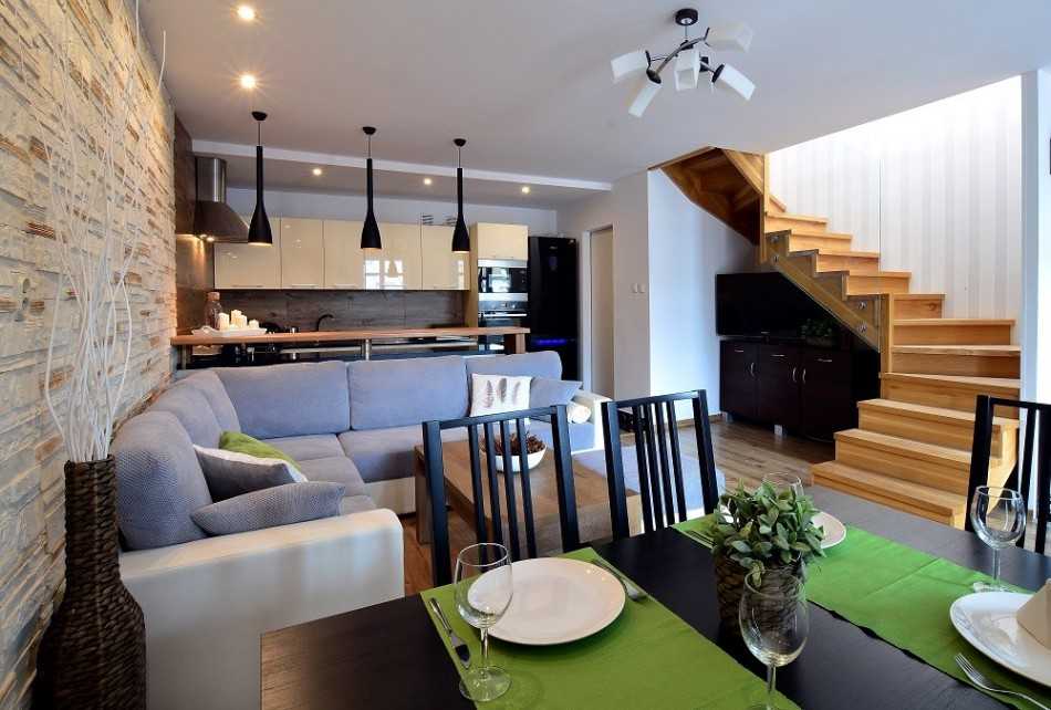 - перепланировка помещений, создание единого жилого пространства либо на нижнем, либо на верхнем этаже. Обычно используется именно второй вариант, наверху оборудуется своеобразная приватная зона. Кроме того, можно обустроить шикарную кухню-студию, объединив ее со столовой;
