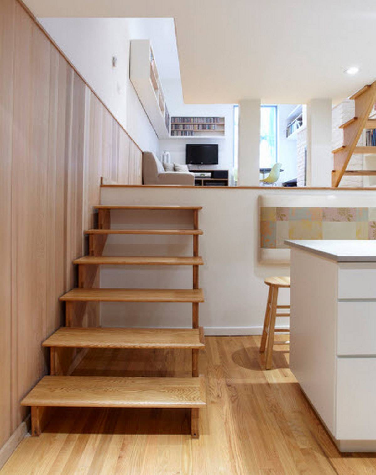 Грамотное расположение лестницы не будет красть пространство небольшой двухуровневой квартиры