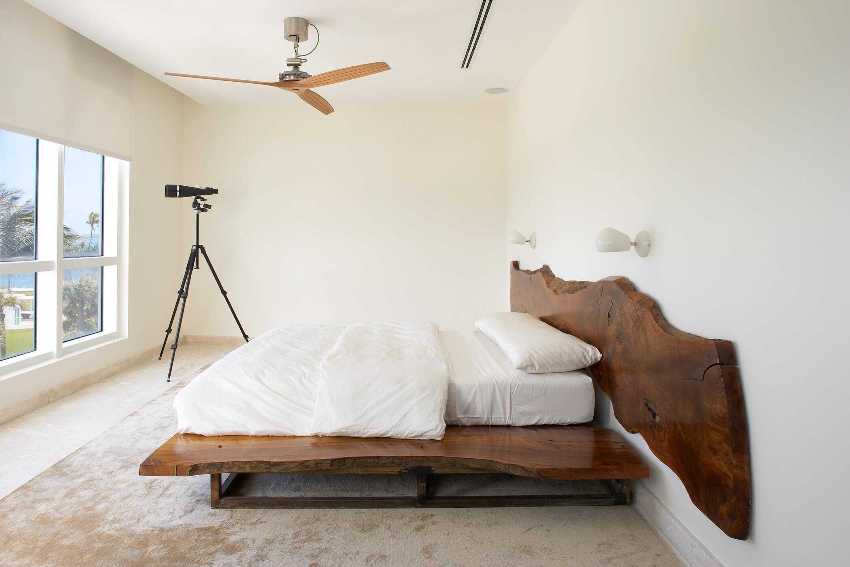 На заметку! В качестве прикроватного столика можно использовать корягу, накрытую прозрачным или матовым стеклом.