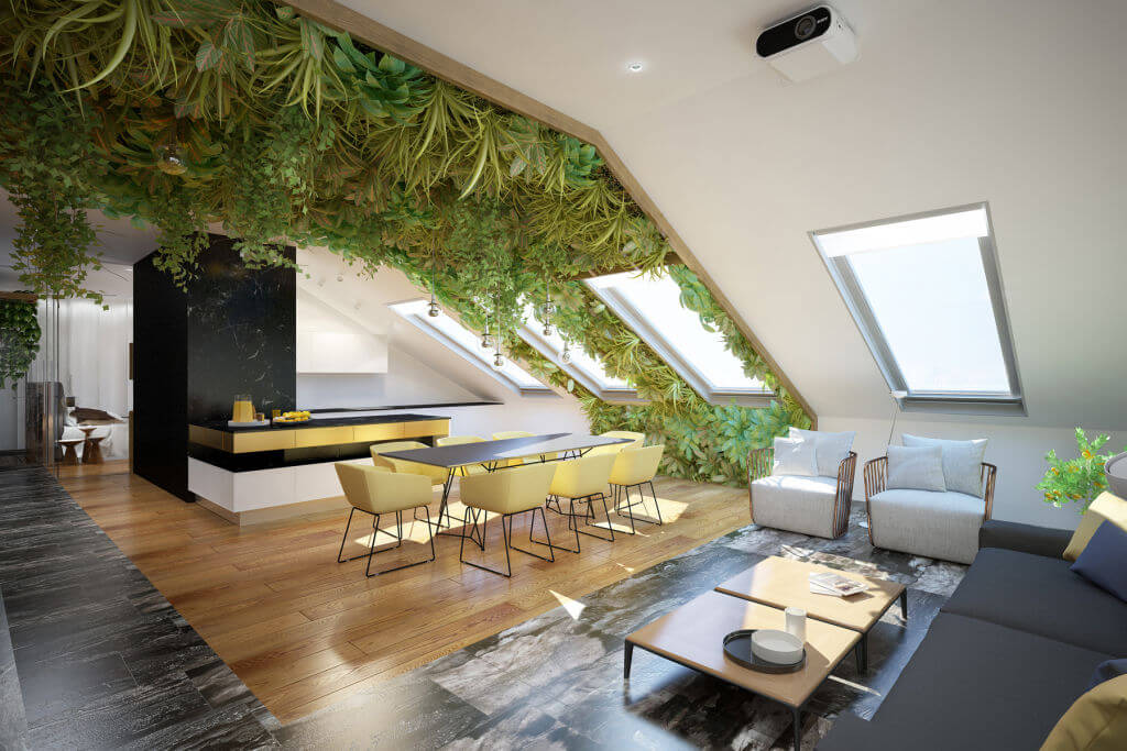 Оригинально и необычно смотрится живой потолок в гостиной в экостиле