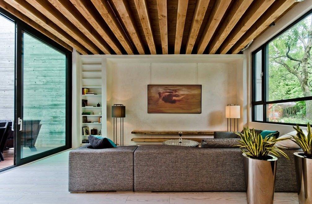 В гостиной в экостиле можно часто встретить балочный деревянный потолок