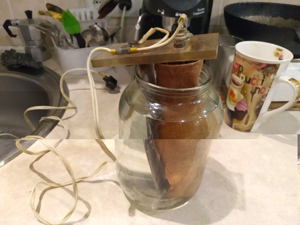 Погружаете в банку аппарат. Длинный электрод в банке, а короткий в мешочке. Включаете прибор в сеть.