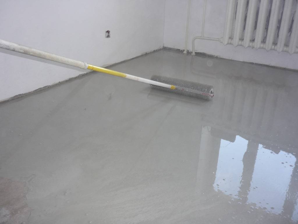 Перед тем как начать грунтование пола, необходимо убрать при помощи пылесоса осевшую на него пыль. После этого можно приступать к нанесению грунтовочного слоя. Если текстура поверхности шероховатая, то будет достаточно двух нанесенных слоев, но если поверхность гладкая, следует сделать 3-4 слоя. Каждый очередной слой наносится только поверх окончательно высохшего предыдущего. Грунтование способствует увеличению адгезии основания с наносимым на него материалом.