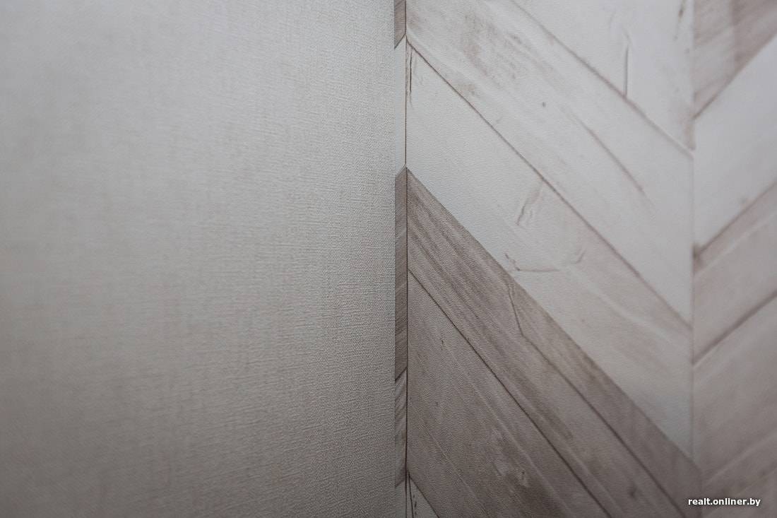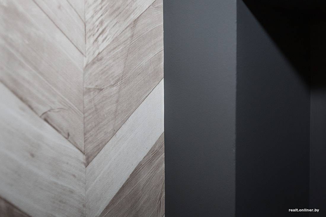 Что касается оклеивания стен обоями: при беглом осмотре кажется, что все хорошо. Но если посмотреть внимательно, видны недочеты. В гостиной обои с рисунком «елочкой» с обеих сторон начинаются не с ровного края трубки, а с подрезки. Из-за этого виден небольшой клин при стыковке с однотонными обоями. Почему так сделано, загадка.