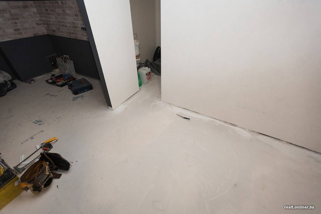 Настало время изучить пол. Старательные отделочники из «ПриватХаузКонцепта» решили провести апгрейд стяжки самонивелиром по всей площади квартиры.