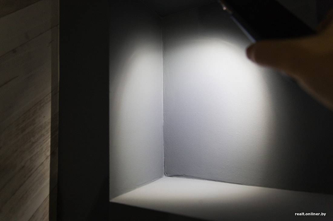 Организацией освещения в комнате можно подчёркивать наиболее выигрышные места и скрывать неудачные. Скрыть кривизну стен и потолка можно отказом от потолочных кромок и напольных плинтусов.