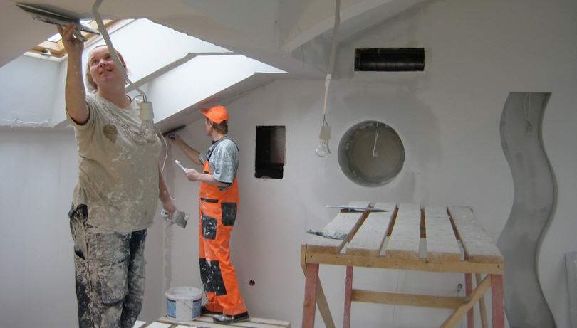 - Следующим достаточно трудоемким этапом будут штукатурные работы. Параллельно с ними устанавливаем короба из гипсокартона для подвесного потолка, если это входит в ваши планы.
