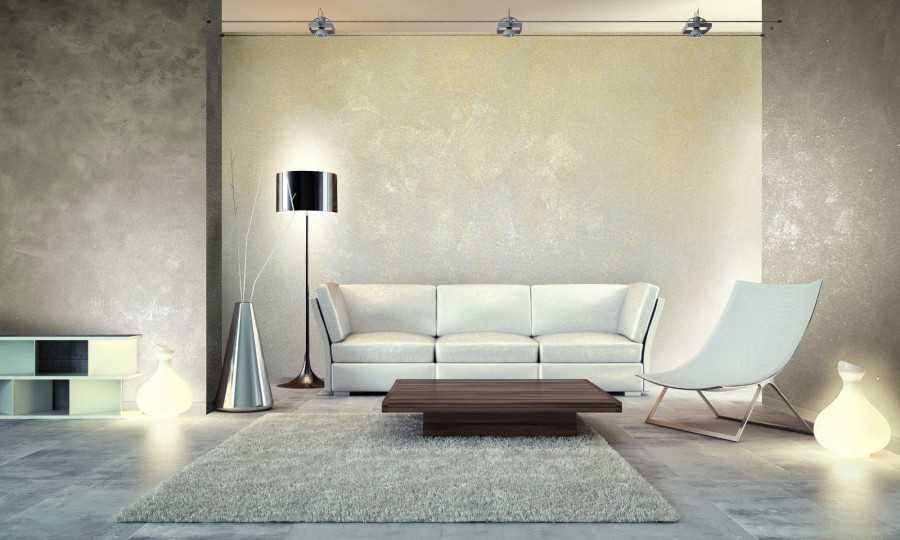 Комната, где нет ограничений — гостиная. Уместен объем и плоскость, яркие и спокойные оттенки, глянцевый и матовый эффект. Фактурную краску подбирают по размеру: чем меньше зал, тем более светлой, блестящей должно быть покрытие.