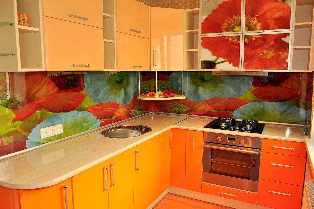 Кухонный фартук должен перекликаться с цветовой гаммой и стилем интерьера в целом. Так, например, цвет панели можно подобрать в тон фасадов гарнитура и/или других элементов обстановки, скажем, в тон штор или обоев.