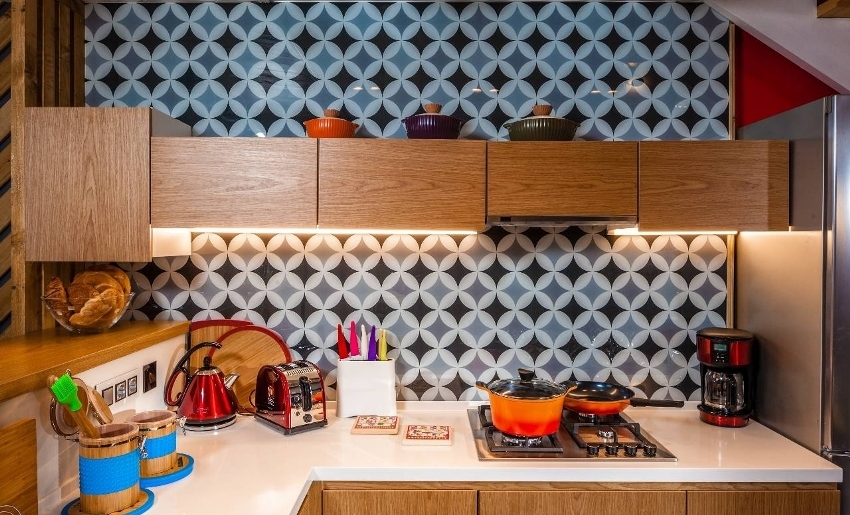 Плитка может быть выполнена в форме мозаики, полос, молдингов. Если нужно разграничить пространство в кухне – можно использовать люксферы – стеклянные кирпичи. Они хорошо пропускают свет и выглядят очень оригинально.