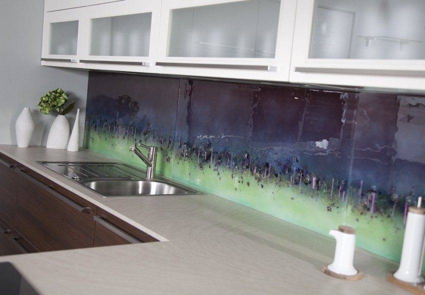 - Флоат-стекло (М1, витринное). Кажется абсолютно прозрачным, но в толщине приобретает выраженный зеленоватый «бутылочный» оттенок. На фартуке с яркими насыщенными красками эффект не проявляется. Но, если пейзаж или натюрморт выполнен в светлых красках (или на светлом фоне), зеленоватый оттенок может свести на нет всю красоту.