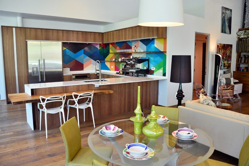 При выборе цвета и рисунка стеклянного фартука следует ориентироваться на общее стилевое решение кухни