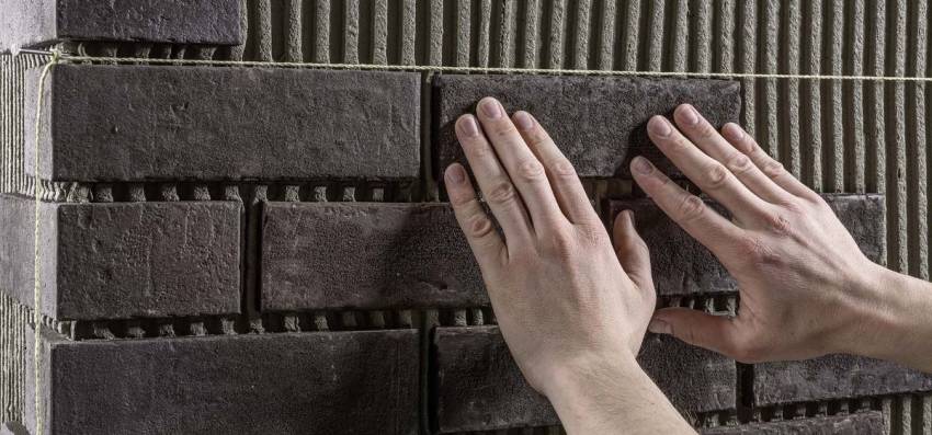 Клинкерная плитка клеится на предварительно нанесенный на поверхность стены клей