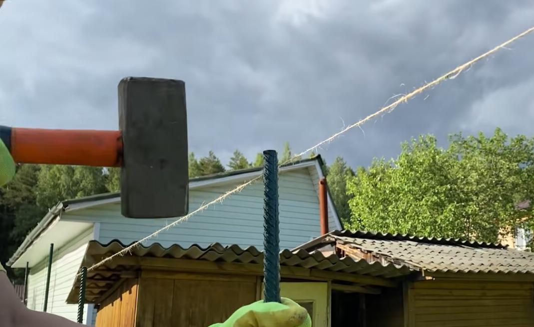Шаг 4. Теперь, отмерив приблизительно 2 м от первой стойки, вбивают следующую. Аналогичным методом монтируются оставшиеся столбики, контролируя их одинаковую высоту и расположение по одной траектории;