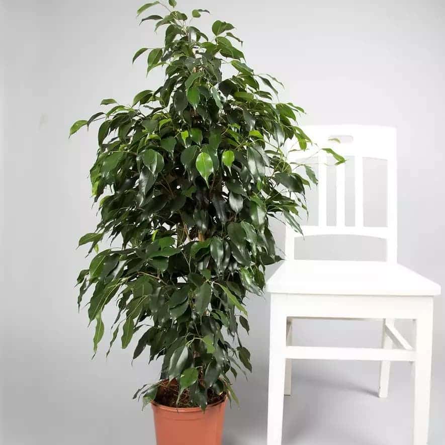 Фикус Бенджамина, один из популярнейших видов вечнозеленых растений. Комнатное деревце имеет среднего размера изумрудную листву и прямостоячий ствол, порой приобретающий причудливую форму, в виде сплетения нескольких крупных побегов, ниспадающие веточки, и ярко-зеленую пышную крону.