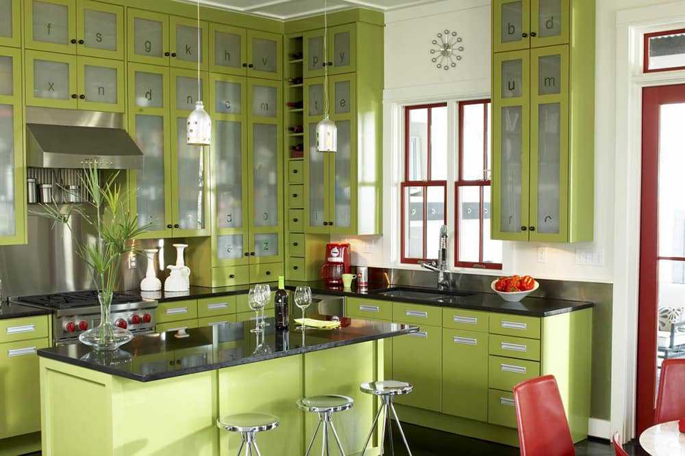 Хай-тек. Фисташковый может отлично сочетаться с пластиковыми и хромированными элементами. Чаще всего его используют для оформления кухни – фисташковыми делают фасады шкафов. Впрочем, и в гостиной или спальне он вполне уместен.