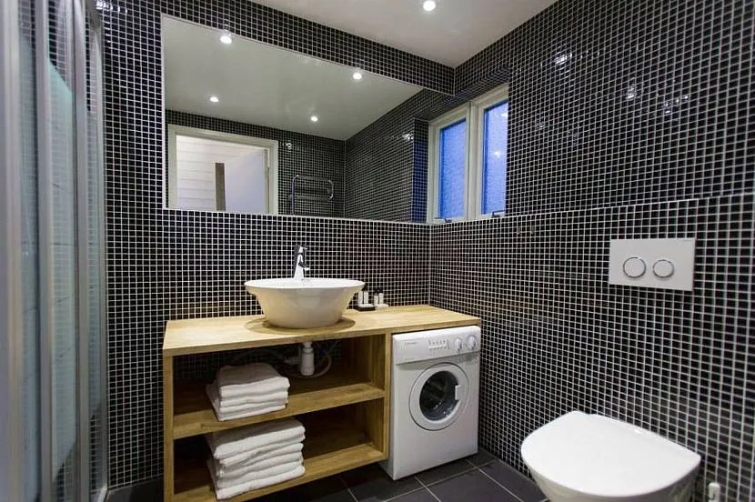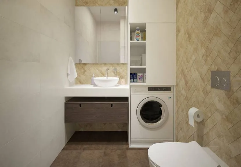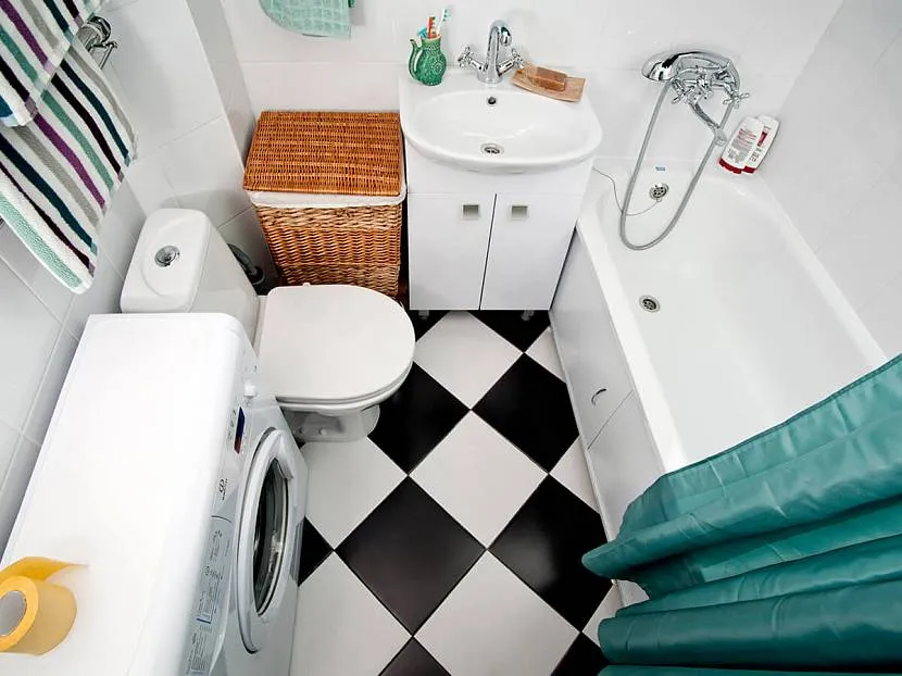 Этот способ дизайна ванной комнаты в квартире-хрущевке со стиральной машиной — скорее, экстремальный, чем общепринятый, но вполне осуществимый при правильном подходе
