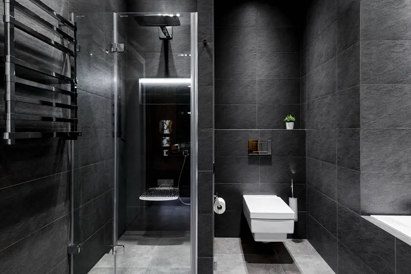Цвет визуально скрадывает метры, подходит для просторного помещения. Роскошно смотрится темная плитка на стенах, полу в классике, индустриальном стиле и минимализме. Черный, графитовый редко используется соло, в качестве компаньонов применяют: