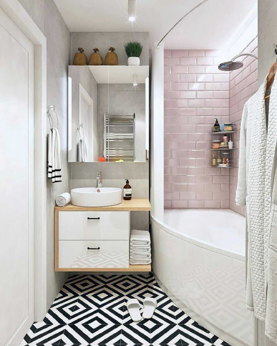 Для отделки ванной небольшой площади нужно использовать керамическую плитку среднего размера: 200×300, 300×300, 450×450, 500×500 мм. Нежелательно приобретать материал более крупных параметров, это визуально будет давить на человека. При подборе плитки главное − остановиться на сочетаемых светлых оттенках. Правильно подобранная цветовая гамма наполнит комнату дополнительным светом и лёгкостью. Также для увеличения объёма можно пустить цветную окантовку на расстоянии 2/3 от пола. Разнообразные фото дизайнов ванной комнаты маленького размера в нашей галерее помогут найти свой вариант оформления.