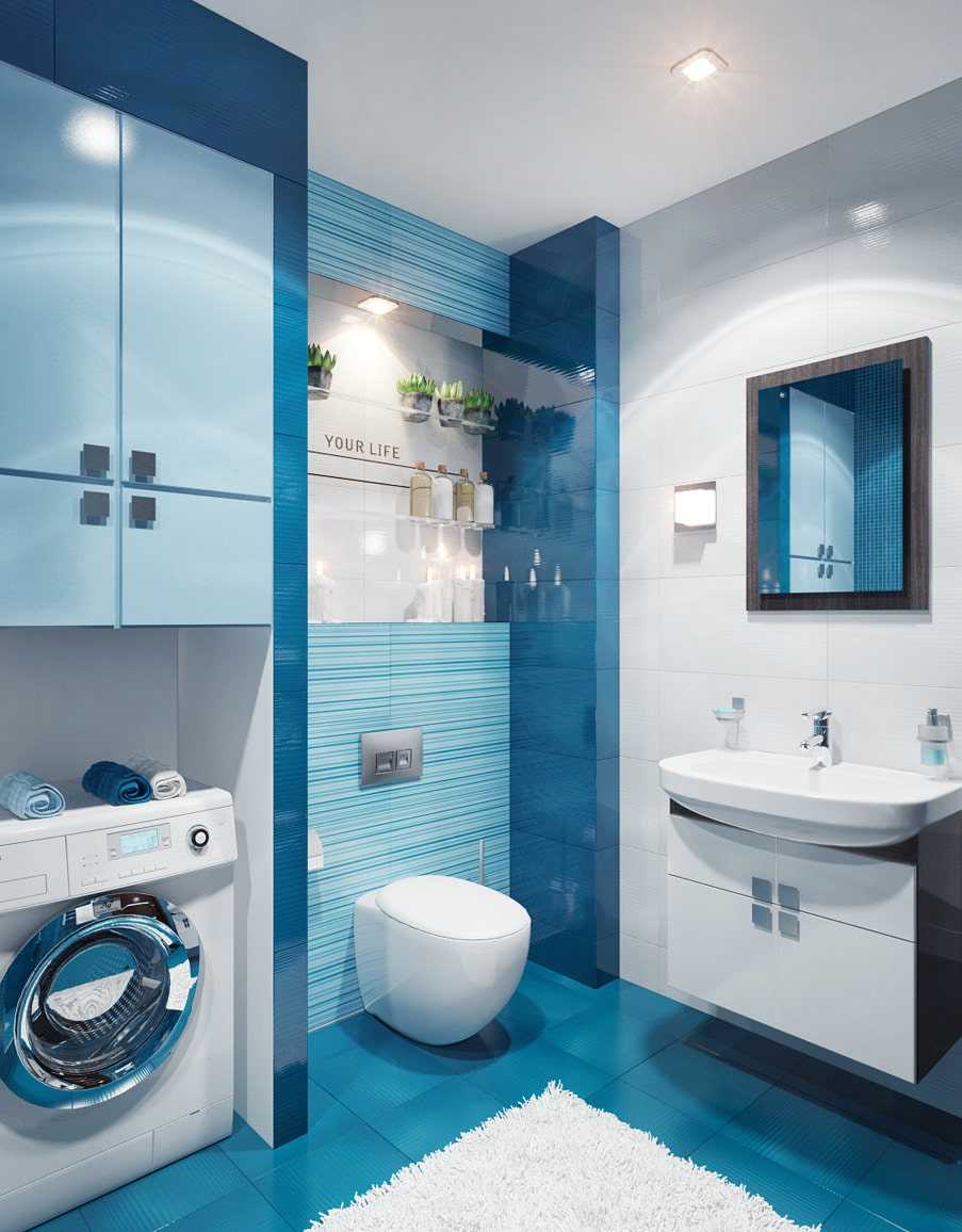 Холодный цвет дизайнеры рекомендуют использовать в дуэте с белым в классике и минимализме. Резкие переходы от одного тона к другому привносят в пространство ощущение свежести. Корпус стиральной машины не стоит прятать под панелями, а обыграть контраст с голубыми стенами. В ванной комнате нужно хорошее освещение, иначе интерьер выглядит мрачным.