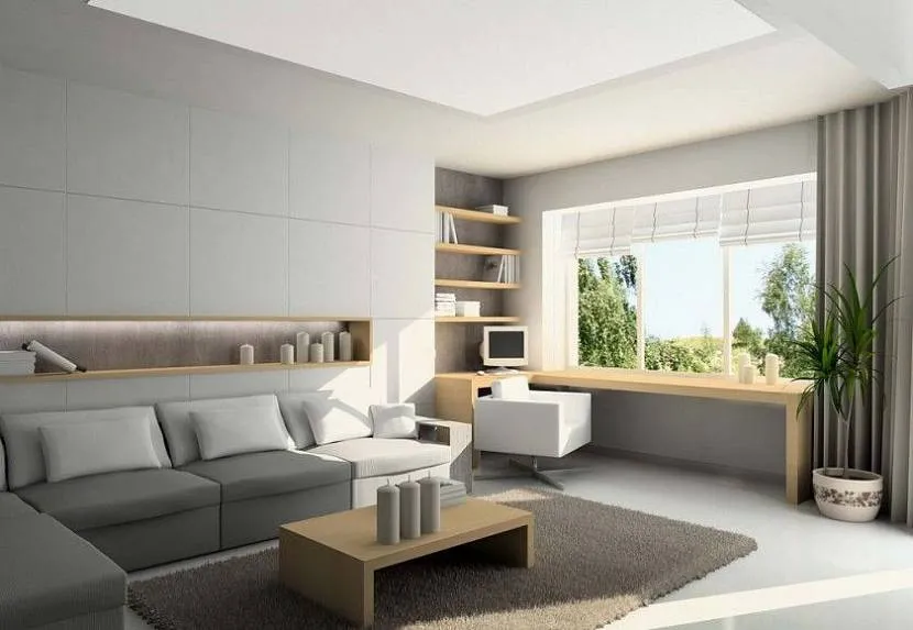 Для современной гостиной комнаты размером 18 кв.м очень подходит стиль минимализм. В этом стиле достаточно легко можно совместить несколько функциональных пространств. Для этого лучше всего использовать светлую гамму цветов (бежевый, белый, светло-серый) с яркими акцентами в интерьере.