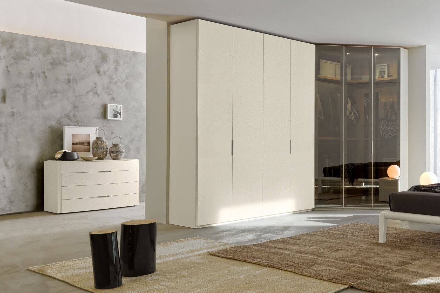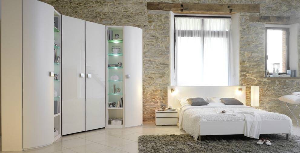 Шкаф радиусный угловой в спальню монтируется по тому же принципу, что и в другие помещения. Основным критерием для устройства места хранения является свободное пространство и желание клиента. Угловая конструкция и дверки по типу «купе» позволят сэкономить место в небольшой спальне, а фотопечать или зеркальные вставки визуально расширят помещение. Главное, не переусердствовать со вставками из зеркал или дополнительной подсветки — ведь спальня в первую очередь должна располагать к уютному времяпровождению и не раздражать вычурностью отделки.