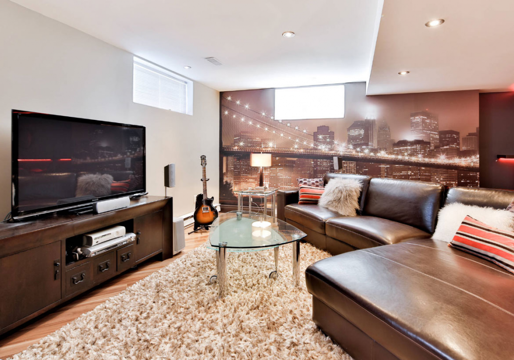 В больших помещениях возникает проблема, когда элементы просто теряются в пространстве. В этом случае стены отделывают обоями с крупными картинами, визуально сужая гостиную.