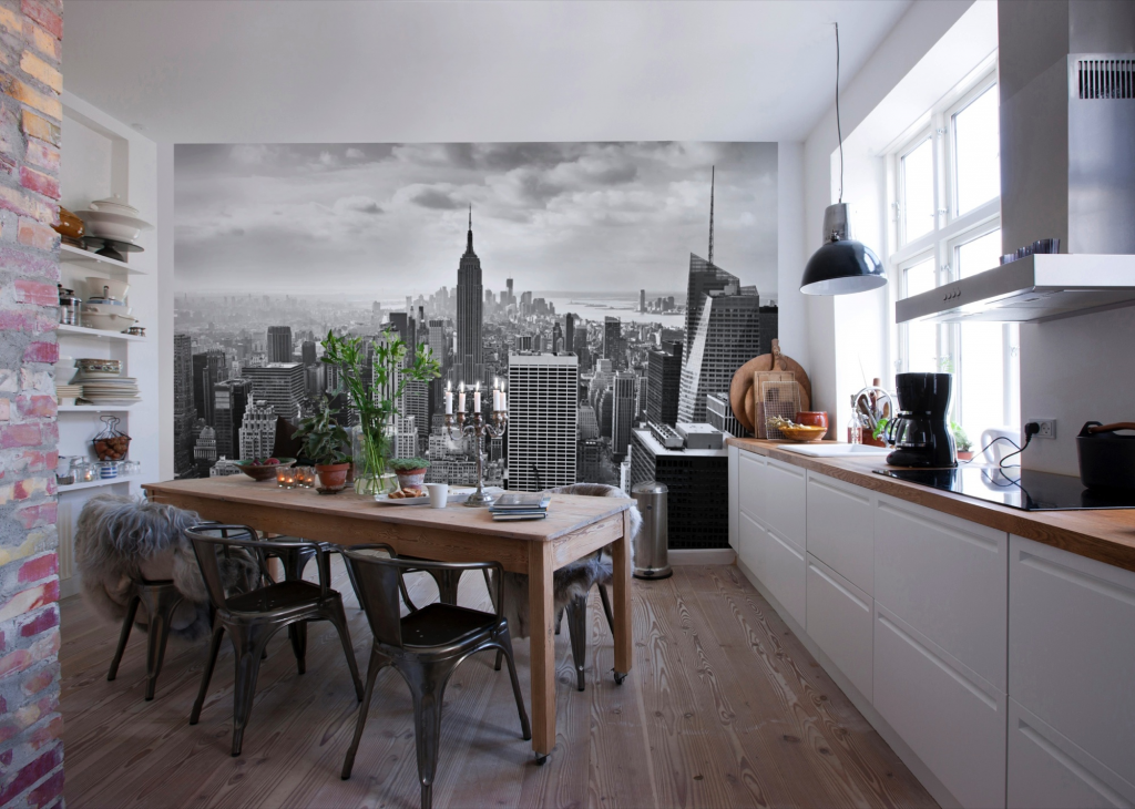 Контраст. Резкие переходы цветов также зрительно увеличивают пространство. Для комнаты небольшой площади квадратных габаритов подойдут фотообои с одним крупным предметом в центре. Помещение сразу удлиняется. На маленькой кухне можно сделать панораму с перспективой или необычным рисунком.