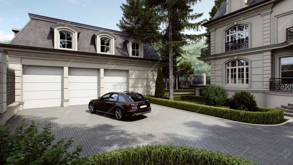 Коттедж во французской стилистике выглядит аккуратным, изящным и очень гостеприимным. Впечатление поддерживают ухоженные газоны с прогулочными дорожками, большая мощеная площадка с подъездом к гаражу.