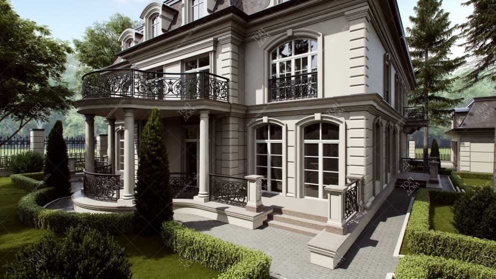 Светлая цветовая гамма и сдержанный декор в виде рустов и рельефных наличников позволяет акцентировать внимание на изящных фасадных линиях, а также красивой ажурной ковке ограждений и оконных решеток. Очаровательный штрих — декоративный металлический заборчик по периметру крыши.