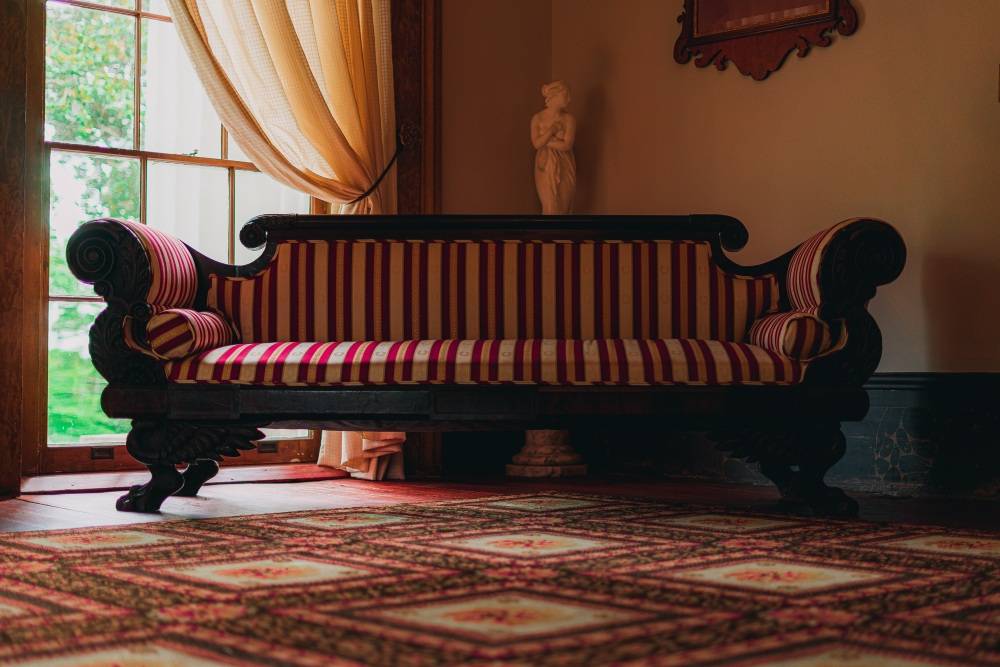 - Изящный мягкий гарнитур с отчасти вычурными деталями подчеркнет величие стиля: можно использовать подлокотники из дерева, высокие ножки.