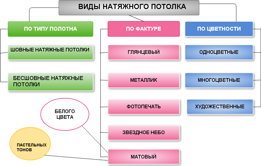 Сейчас натяжные потолки по типу используемого материала бывают тканевые бесшовные и из виниловой пленки.