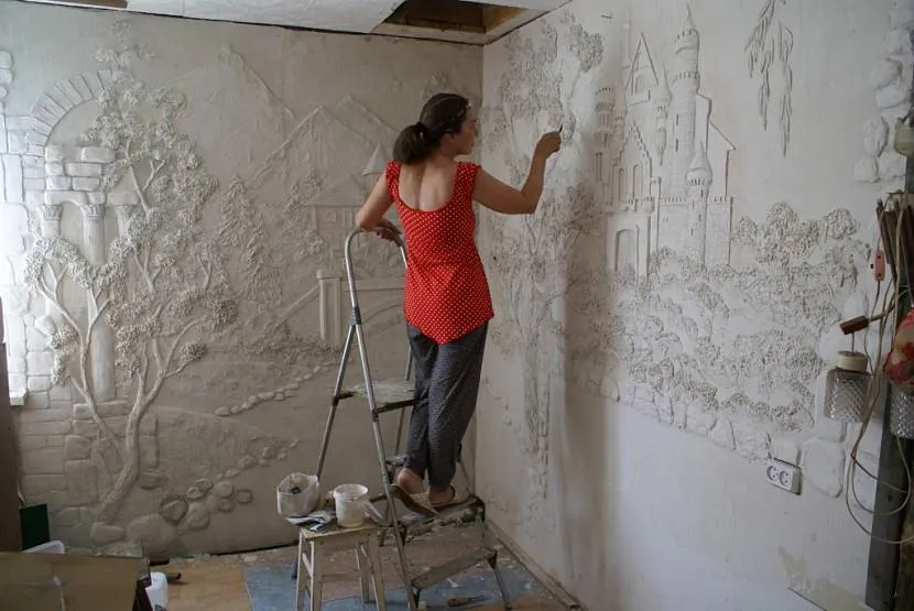 В этом случае используются раствор и армирующая сетка, однако принт наносится в специальных заводских условиях. Готовый продукт крепится к стене посредством клеевых составов, которые рекомендуются производителем. Края фрески для придания элементу естественности можно обработать штукатурным раствором.