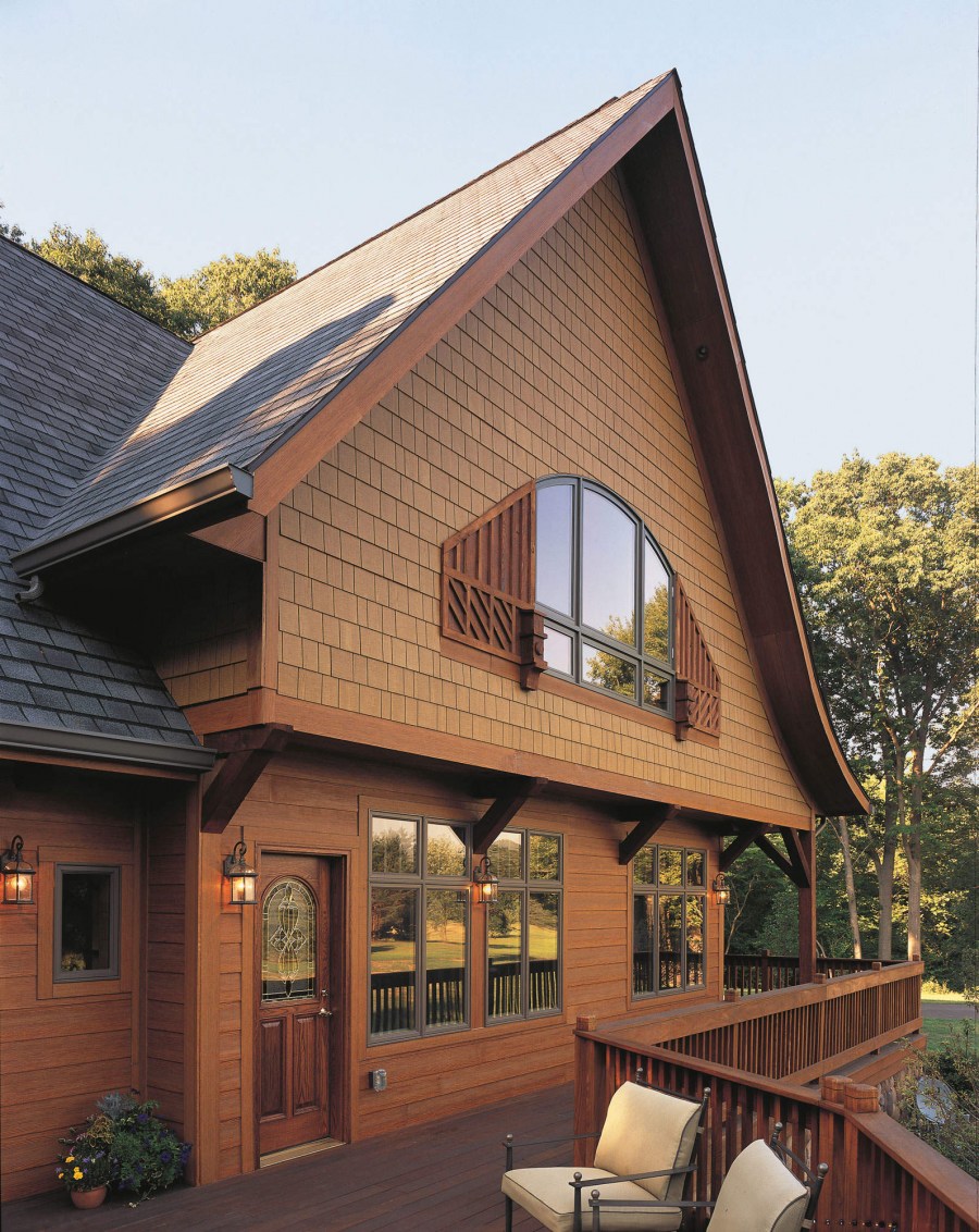 Обшивка фронтона вагонкой или сайдингом выполняется в таком же стиле, что и весь дом