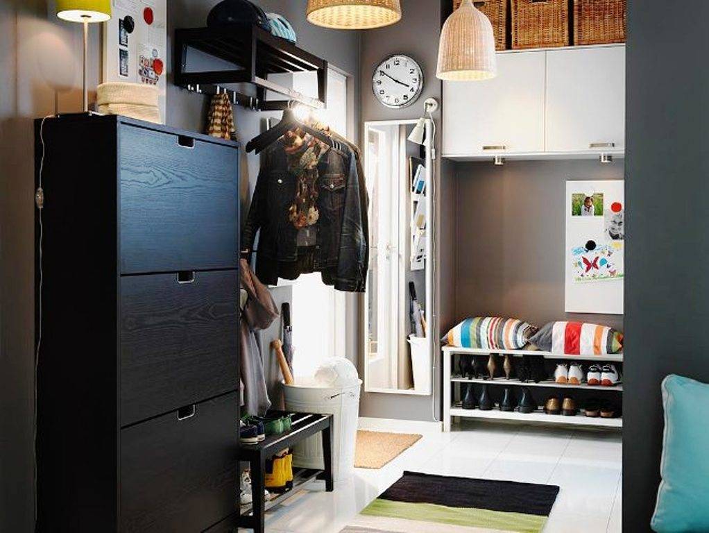 В небольшой прихожей надо учитывать все нюансы, на разных фото обувницы в прихожие представлены в разных вариантах. Большой ассортимент предлагают магазины Икеа, обувниц в прихожую здесь огромный выбор – на разный вкус, метраж и дизайн. Как вариант – вешалка с обувницей в виде цельного модуля.