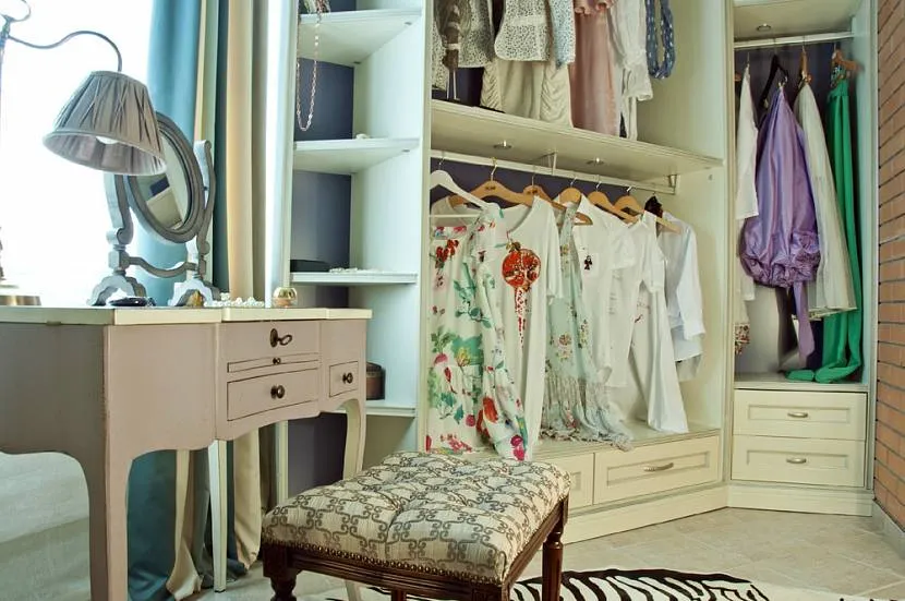 10. Пуфами, консолями, туалетными столиками. Эти предметы появляются только в просторных гардеробных и к обязательным не относятся. Их отсутствие не отразится на общем функционале помещения.