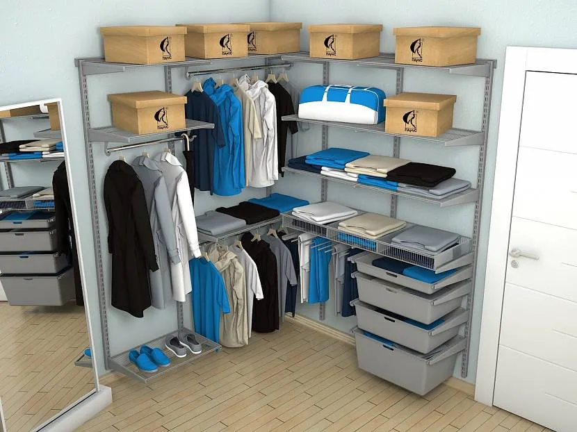 Рекомендуется спроектировать оптимальную расстановку коробок, контейнеров и органайзеров из пластика, ткани, соломки или дерева. Они идеально подходят для размещения ремней, галстуков, платков, перчаток, а также одежды, не требующей глажки. Кроме того, такие системы хранения помогают сэкономить место на стеллажах, быстро находить нужные вещи.