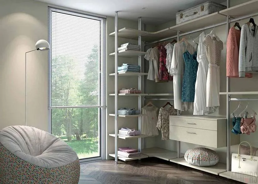 Отличный пример мини-гардеробной, которая занимает мало места. Каркас и полки для нее нужно подбирать под цвет стен, чтобы они не выделялись на их фоне.
