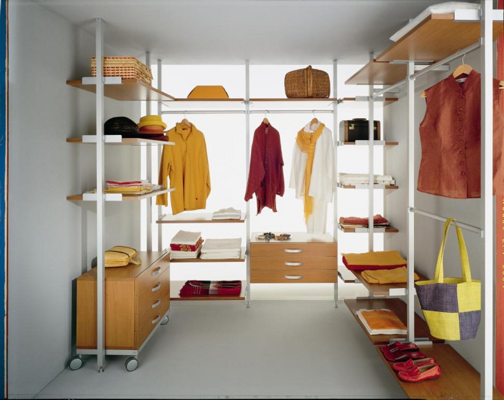 Можно покупать различные предметы мебели по отдельности, только тогда потребуется более тщательный расчет и хорошее чувство вкуса. В гардеробной можно совместить стеллажи, комоды, полки и т.д.;