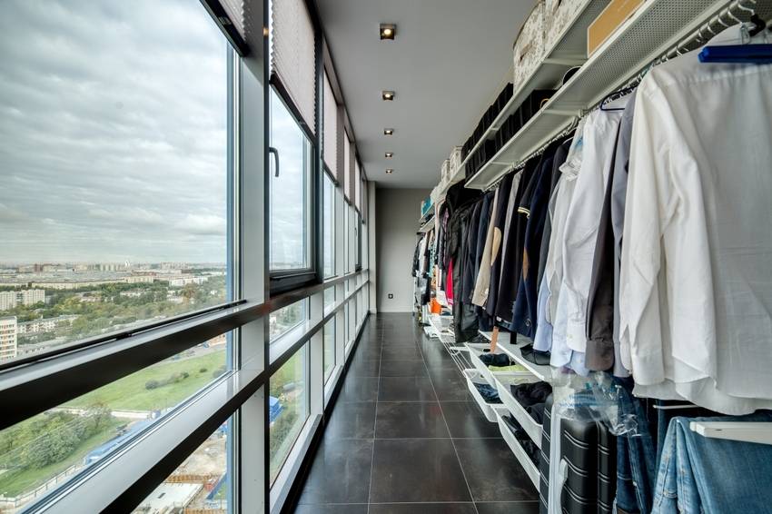 Этот вариант позволяет экономить свободное пространство в жилом помещении. За счет хорошей вентиляции воздух в гардеробной не будет застаиваться, а использование лоджии даст возможность хранить не только вещи, но еще и обувь, верхнюю одежду и другие предметы гардероба.