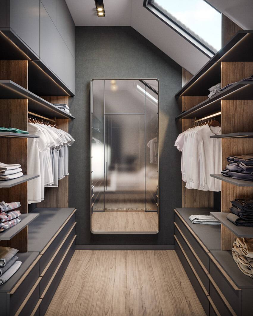 При достаточной ширине части гардеробной размещают на противоположных стенах