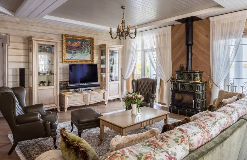 Для гостиной в классическом стиле подойдут также французские шторы. Они, может чересчур парадные и не совсем практичные, но смотрятся шикарно и придают некую романтичность.