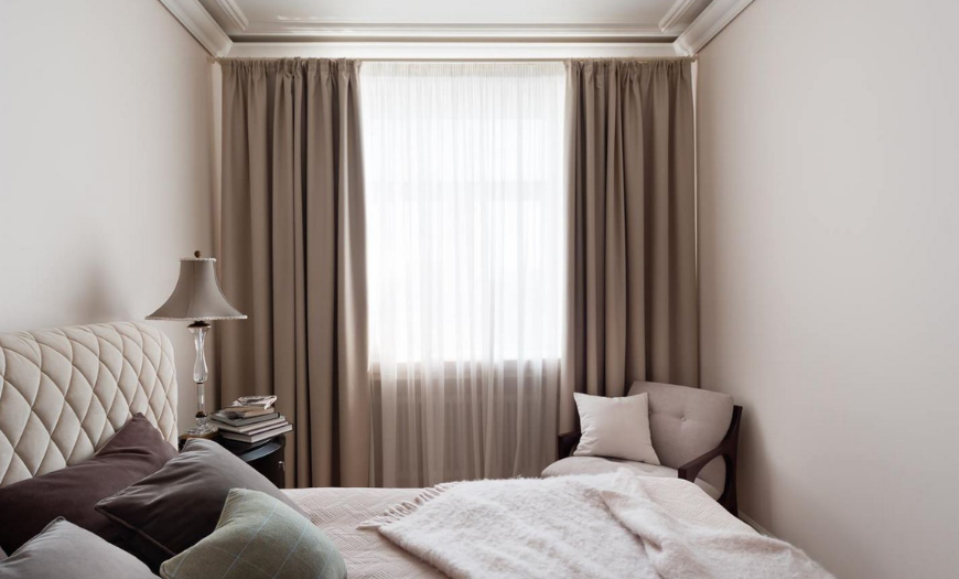 Еще один вариант мягко разделить пространство – шторы. При необходимости они сыграют роль перегородки, а в остальное время послужат дополнительным украшением спальни.