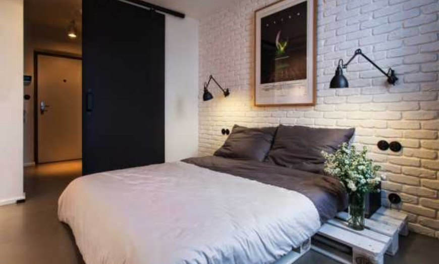 спальня, рабочее место и гостиная отделяются друг от друга при помощи цвета, отделочных материалов, мебели,