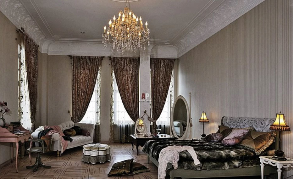 Особняк площадью четыре тысячи квадратных метров был построен с размахом. Его обустройством и занимались самые именитые дизайнеры. Не только потолки, но и стены украшает оригинальная лепнина тонкой работы. С потолка свисают огромные многоярусные хрустальные люстры. А от удивительной красоты мраморного пола, эксклюзивной мебели ручной работы из карельской березы и красного дерева и наличия антиквариата кружится голова.