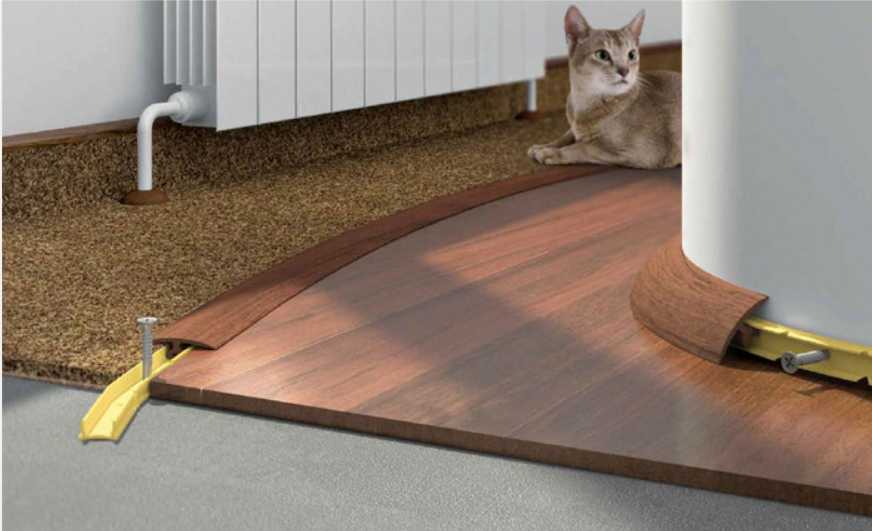 - Пластиковые – эти модели принято считать самыми доступными и дешевыми, что не совсем правда. Действительно, самые простейшие образцы очень дешевы, но вот те, которые могут маскировать кабель-канлы, стоят намного дороже. Обычно, они еще и имеют прорезиненные края, а выпускают их фирмы, специализирующиеся на производстве ламината. Их также предпочтительнее приобретать у того же производителя, что и изготовил напольное покрытие, дабы достичь полного совпадения цвета и фактуры.