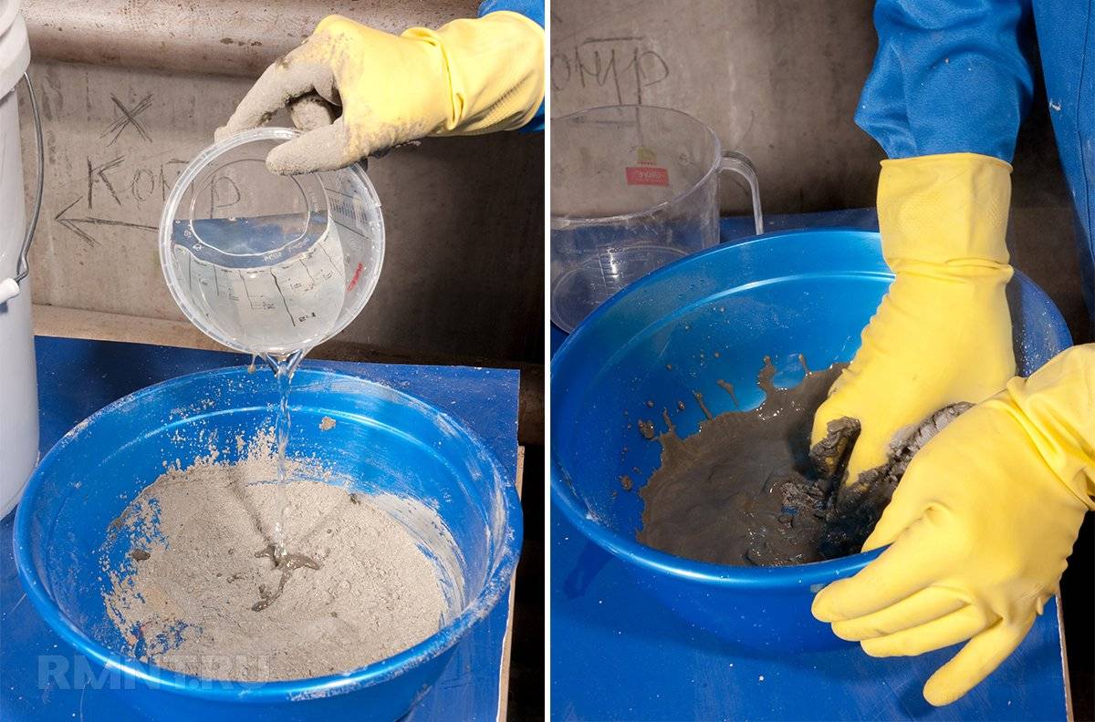 Готовить состав необходимо строго по инструкции производителя. Средство при контакте с водой дает щелочную реакцию, поэтому обязательно использовать защитные очки и перчатки. Некоторые смеси вносят в жидкость, другие, наоборот, насыпают в сухую емкость и разбавляют до получения однородной консистенции. Нельзя добавлять в раствор ничего, кроме воды.
